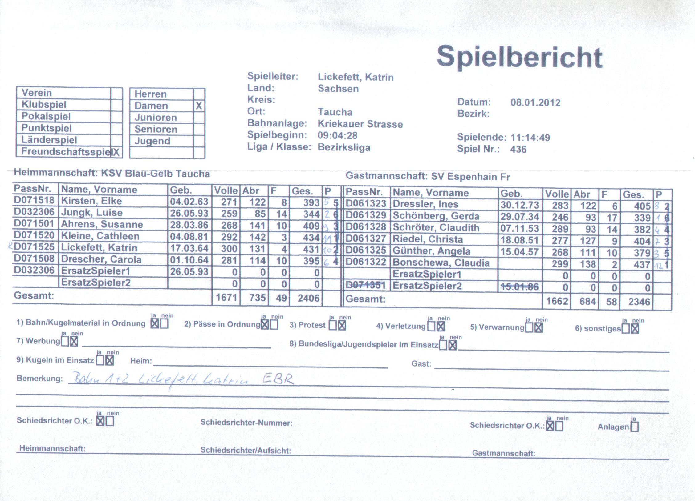 | 08.01.2012 | KSV BG Taucha | : | SV Espenhain 91 | 2406 | : | 2346 | Cathleen Kleine | 434 | jpg |