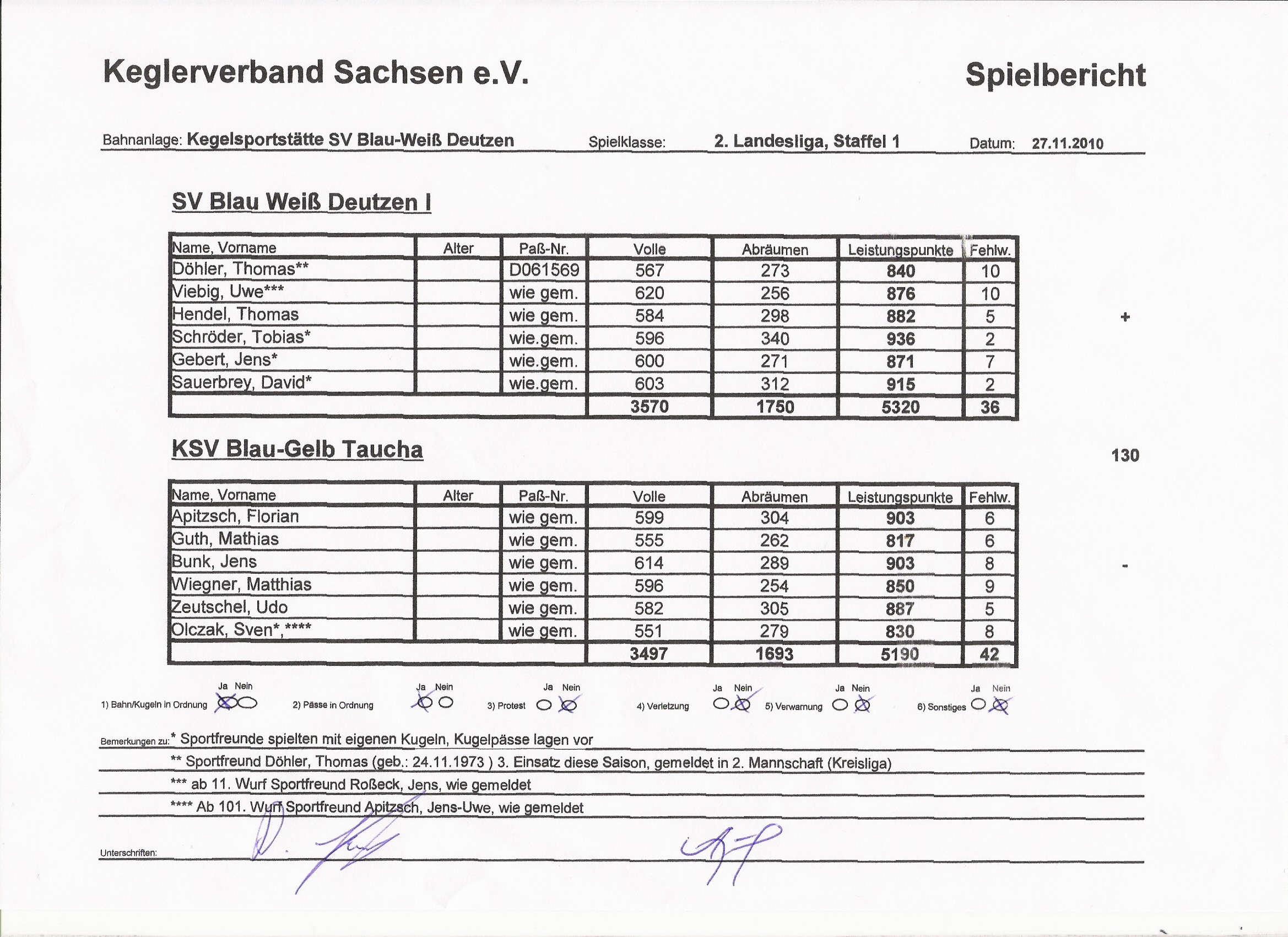 ⇓ 27.11.2010 SV B-W Deutzen I - KSV Blau-Gelb Taucha5320 : 5190