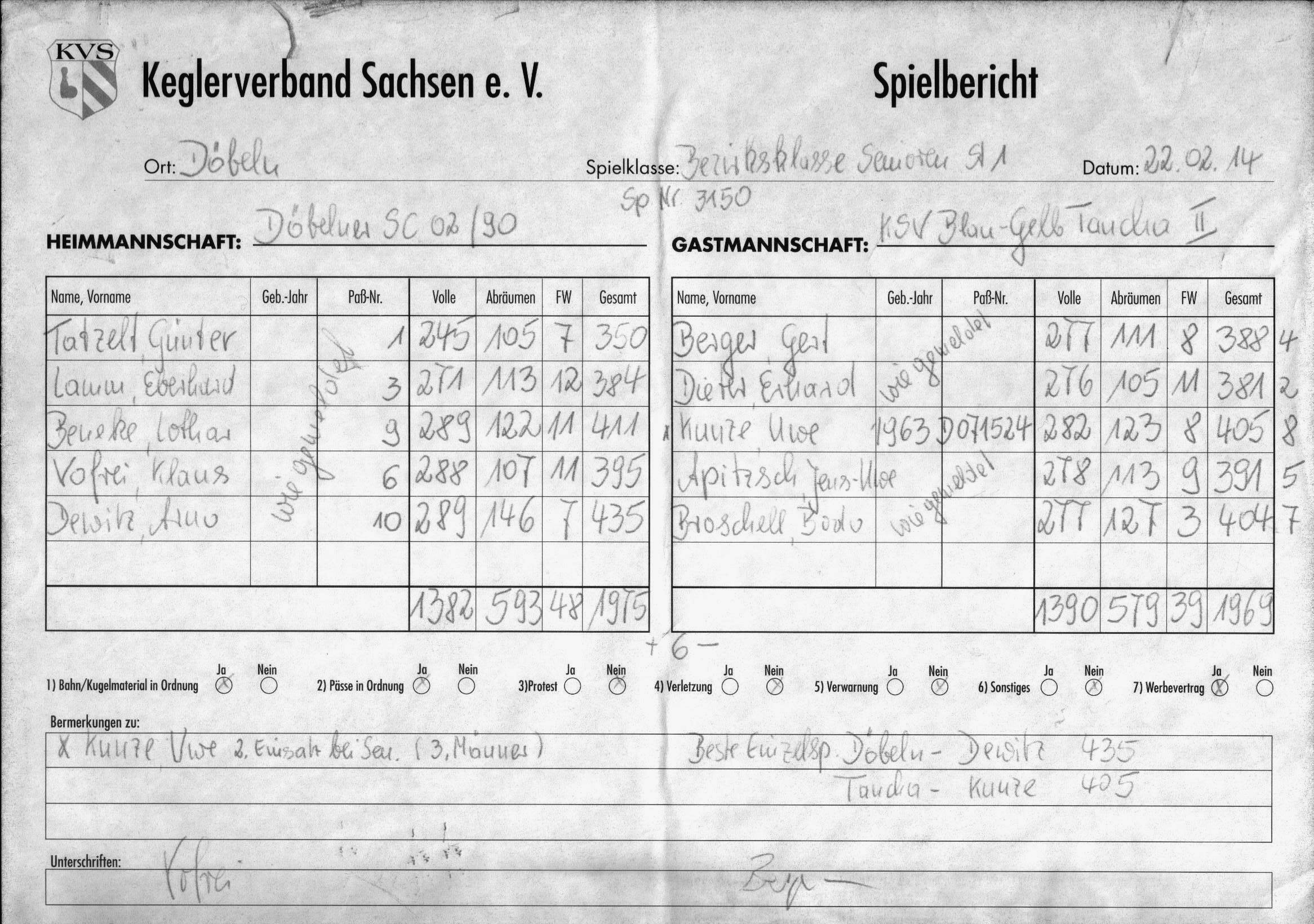 Wie Kegeln ist, jetzt lief es bei Bodo in die Vollen, beim Gegner ging nichts. Vor den Räumern hatte Taucha wieder einen Vorsprung von über 50 Punkten. Und Duplizität der Ereignisse zu den ersten 50 Wurf. Guten Vollen, folgten mäßige Abräumer auf Tauchaer Seite, während Paunsdorf aufdrehte. Am Ende gingen die letzten 50 Wurf pari aus, so dass der Sieg mit 29 Punkten feststand.